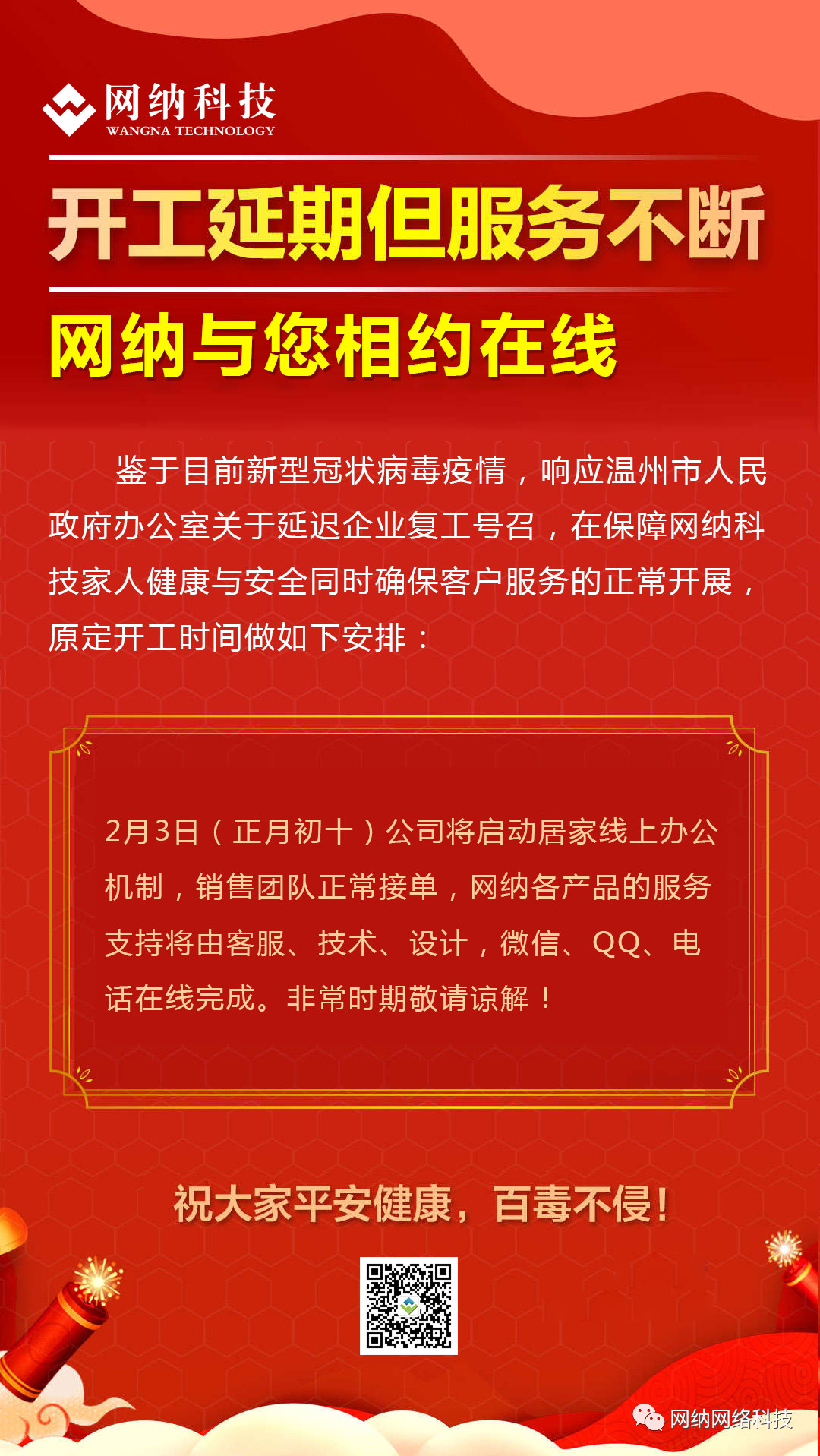 鑒于目前新型π₩∏∏冠狀病毒疫情,響應溫州市(shì)人(rén)民(mín)政府辦公室關于延遲企業(yè)複工(gō&∞≈πng)号召,在保障網納家(jiā)人(rén)健康與安全同時(shí)确保客戶服務的(de)正常開←₽(kāi)展,原定開(kāi)工(gōng)時(shí)間(jiān)做(zuò)如(rú)下(x≥∏™ià)安排:
